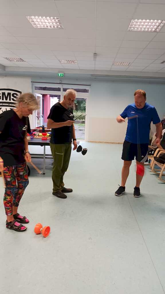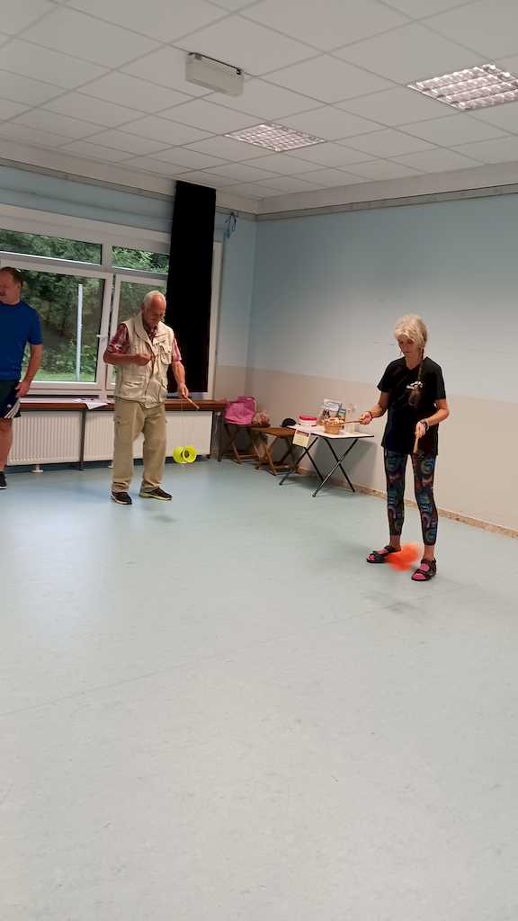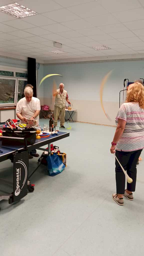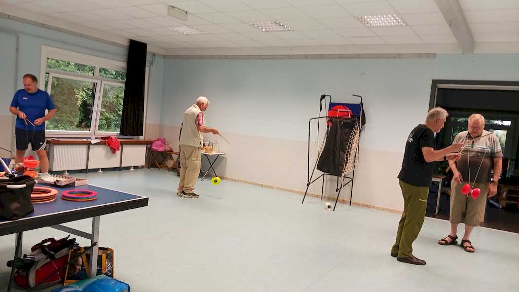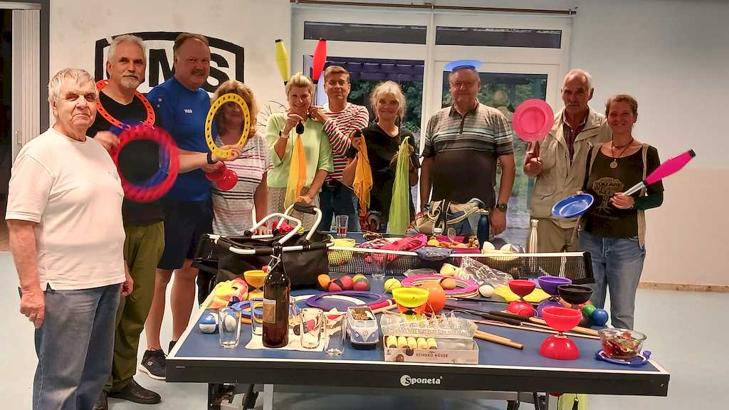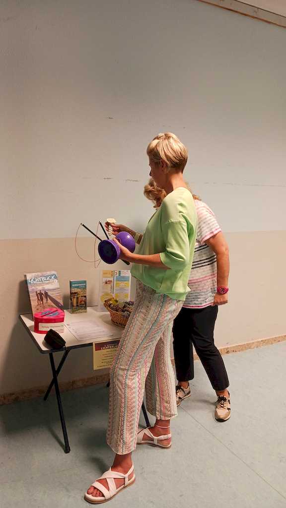 Am 09.09.24 gab es noch eine Veranstaltung mit der Jongliergruppe Luftikus um 18.00 Uhr im Jugendzentrum. Da es regnete, bauten Klaus-Peter und Frank ihre Jongliergeräte auf einer Tischtennisplatte auf und alle Anwesenden versuchten sich mit Peus, Tellern, Ringen, Devel Stick, Keule und Bällen. Es ist gar nicht so einfach, die einzelnen Geräte in Bewegung zu bringen und zu halten. Es waren wunderschöne, gesellige Stunden. In jedem Jahr spendet „Luftikus“ die Gagen von zwei Auftritten, in diesem Jahr von dem Kinderfasching am 10. Februar in der Oberschule Vienenburg und vom Gemeindefest der Ev. Kirchengemeinde Klein Mahner am 22.06.24. Unter den Gästen war auch ein Ehepaar, das auf seiner Hochzeit im vergangenen Jahr vortrefflich mit seinen Gästen von „Luftikus“ unterhalten wurde. Die Gruppe nahm keine Gage, bat aber um die Teilnahme und eine Spende heute. Das Spendenherz wurde von allen gut gefüllt.