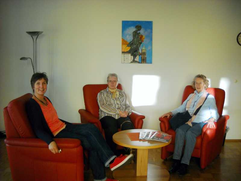 Und dann kam die Gruppe im Besprechungsraum an. Die neuen Aktionsmitglieder waren begeistert von der Architektur und Ausstattung. Ein Rundanbau, der den Eindruck vermittelt, dass über einem die Sonne scheint. Ringsherum Fenster mit Blick ins Grüne. Einfach beeindruckend. Dieser Besprechungsraum steht den Bewohnern für Geburtstagsfeiern oder Zusammenkünfte zur Verfügung. Aber auch Familien, die nicht im Elternhaus wohnen, können diesen Raum nutzen. Die Klinik macht regen Gebrauch von dem Raum, indem sie Schulungen und Besprechungen hier durchführt. Ein Pfleger hat sich in Homöopathie weitergebildet und gibt dieses Wissen nun im Besprechungsraum an seine Kolleginnen und Kollegen und auch an das Elternhausteam weiter. Der Raum wird regelmäßig zum Treffen der Eltern Frühgeborener genutzt, aktuell sind mehrere betroffene Eltern von Säuglingen mit Herzfehlern hier. Auch der ambulante häusliche Kinderpflegedienst KIMBU nutzt diesen Raum.