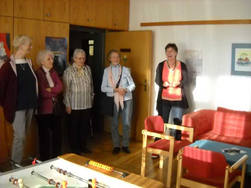 Im Elternhaus begrüßte Fr. Hildebrand-Linne die Gruppe in der gemütlichen Eingangshalle. Hier bewegten gerade die neuen Teammitglieder die vielen Fotos an den Wänden mit Kindern in vielen Situationen ihrer Krankheit, Kindern später zu Haus aber auch Kindern in ihrem Abschied. Dazu die Briefe der Eltern – mitnehmend, bewegend – kaum zu beschreiben. Die langjährigen Teammitglieder erkannten auch die neuen Fotos und Danksagungen und freuten sich über jedes Kind, das heute wieder gesund leben darf. Das Elternhaus beschäftigt 9 Mitarbeiterinnen und Mitarbeiter, davon vier im psychosozialen Bereich, drei davon in Teilzeit, eine in Vollzeit. Das psychosoziale Team hat drei weibliche und einen männlichen Mitarbeiter. Gerade dieser Bereich ist wichtig, denn die Familien werden aus ihrem ganz normalen Leben abrupt herausgerissen, müssen organisatorisch, finanziell aber vor allem seelisch unwahrscheinlich viel verkraften. Da ist es wichtig, dass jederzeit jemand da ist, der diese Familien auffängt, zuhört, nachfragt, Probleme erkennt und bei der Lösung hilft.