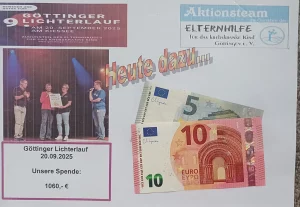 Der Samstag war ein richtiger Hochsommertag, somit der Abend lau und wunderschön. Das übertrug sich allgemein auf die Stimmung. Es war einfach herrlich. Auf der Hauptbühne kommen zwischen den Musikstücken immer wieder Unterstützer und Akteure für das Elternhaus Göttingen zu Wort. So auch das Team aus Goslar. Heike Büchner, 1. Vors. des Elternhilfevereins, nahm von Karin Kolan (Aktionsteam aus Goslar) einen Bilderrahmen mit Fotos der Aktionsgruppen und des Einzelsportlers, dekoriert mit 1060,00 €, entgegen. Die Spendenübergabe aus Goslar auf der Hauptbühne ist inzwischen ein fester Bestandteil des Lichterlaufabends. Die Moderatoren und Frau Büchner dankten allen Akteuren wir ihren Einsatz und ihre Spende. Durch zwei „Nachspenden“ erhöhte sich die Summe auf 1075,00 €.