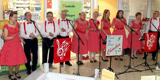 Für 17.00 Uhr war D.A.S. Chörchen mit seinem Deutsche Alte Schlager Programm angekündigt. In diesem Jahr musste wegen des kühlen Wetters der Auftrittsplatz neu gefunden werden. Dank der Unterstützung der LINDA-APOTHEKE, die einen Auftritt vor der Zwischentür zur Mall genehmigte, konnte das Chörchen direkt im Café auftreten und die Gästes begeistern. Durch den neuen Auftrittsplatz fehlten ab 16.00 Uhr im unteren Cafébereich Tische und Stühle. Schnell trugen drei Aktionsteammitglieder die eingedeckten Tische und Stühle aus dem Cafébereich der Empore nach unten und deckten ein. Schließlich sollten alle Gäste zu den kulinarischen Genüssen auch das kulturelle Angebot genießen. Die Reinigung verzichtete fast zwei Stunden auf einen freien Zugang zu ihrem Thresen und machte diese Caféerweiterung möglich. Einen herzlichen Dank hierfür.