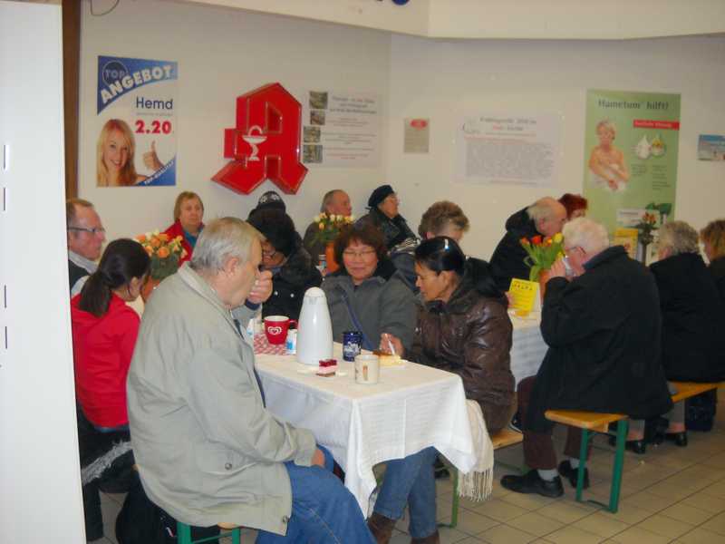 Das Café war von Anfang an gut besucht von vielen Stammgästen, die immer sehnsüchtig auf den nächsten Termin warten, aber auch von vielen neuen Gästen. Die hausgemachten Salate und Mettbällchen, aber auch die Torten und Kuchen in vielfältiger Auswahl sorgten für Genuß vor 0rt oder auf der Kaffeetafel zu Haus.