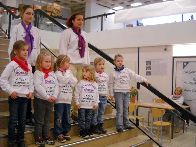 Doch es gibt einen Wehmutstropfen bei unserer Aktion: auch uns hat die Grippewelle voll erwischt: Der Döhrener Kinderchor trat mit der Gruppe der „Vierjährigen“ Sängerinnen, unterstützt von nur zwei „Großen“ Sängerinnen auf. Dennoch konnten wir uns über ein gelungenes Programm und die Begeisterung der Kinder am Gesang freuen.