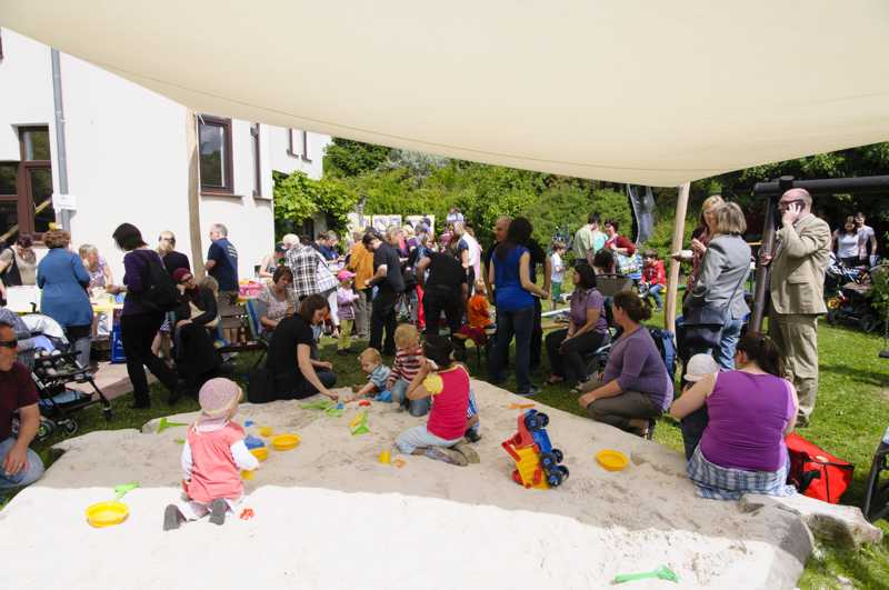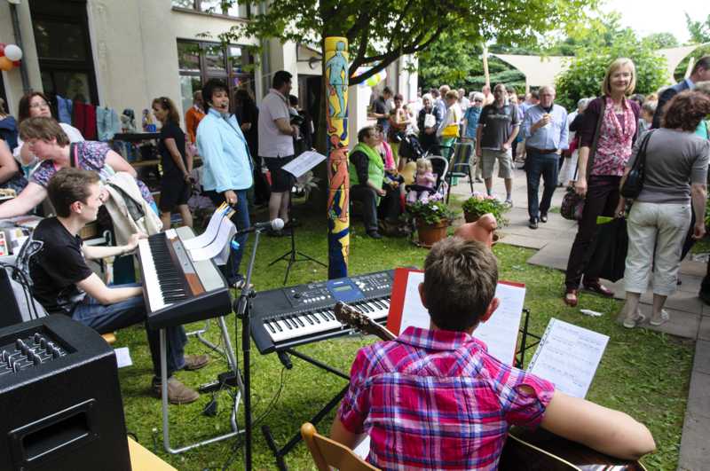 Nach dem offiziellen Teil wartete ein buntes Programm auf die Besucher. Für die Kinder war u.a. mit einer Schminkaktion, einer Schokowurfmaschine und einer Buttonmaschine besonders gesorgt. Wer einmal das Elternhaus und die nähere Umgebung von oben ansehen wollte, konnte sich von einer Hebebühne der Firma Rathmann in die Höhe tragen lassen. Die 1.500 Lose der Tombola waren im Nu ausverkauft. Auch für Livemusik war gesorgt.