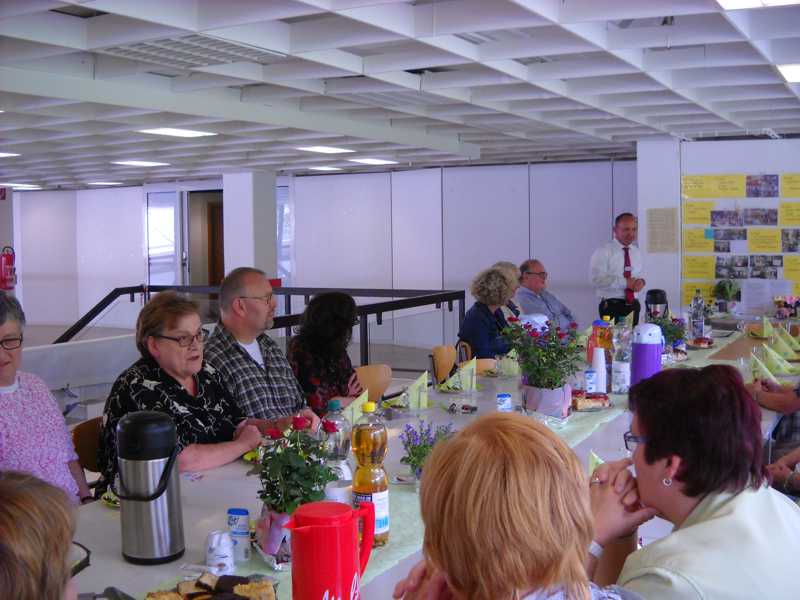 Von den ca. dieses Mal ca. 30 Helferinnen und Helfern nahmen 25 die Einladung an und ließen sich Kaffee und Kuchen schmecken. Anfangs gibt es immer sehr viel zu erzählen. Schließlich ist die Endspendensumme nun bekannt und alle freuen sich über das Erreichte. Während des Kinderfestes gab es wenig Gelegenheit, mal miteinander zu plauschen. Das wurde nun ausgiebig nachgeholt.