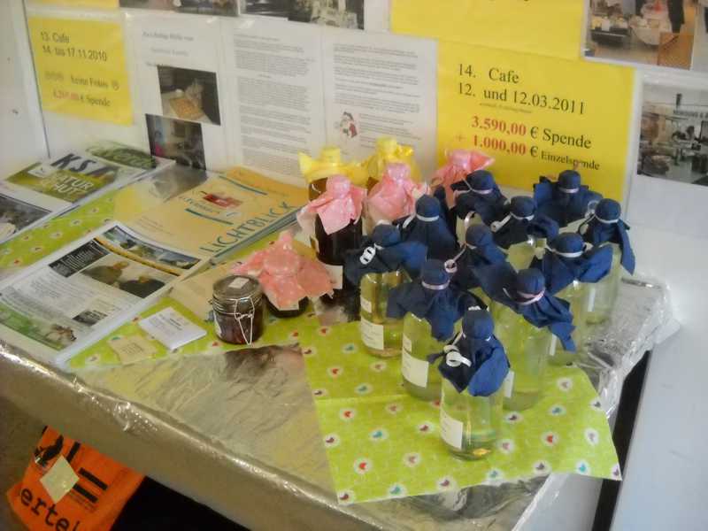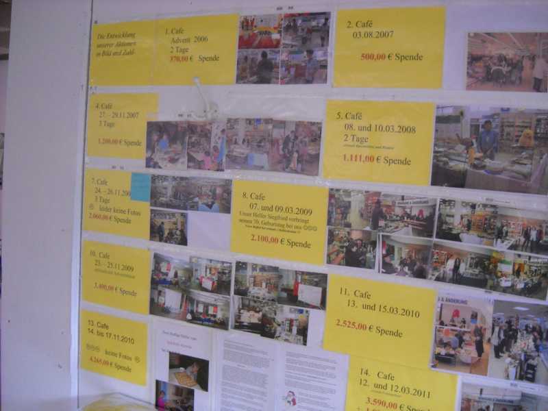 Da das Aktionsteam immer wieder neue Helferinnen und Helfer hat, brachte Fr. Kolan an der Wand eine Übersicht des Wedergangs der Aktionen an. Beginnend im November 2006 mit 370,00 € Spende – bis zum Frühling 2014 mit 5.910,00 € Spende. Fotos zeigen ein kleines, übersichtliches Café am Anfang, dann von Mal zu Mal mehr Auswahl und Angebote, erst Kuscheltiere, dann Flohmarkt, dann professionelle Kinderbetreuung mit Hüpfburg und Kreativspielen, erst Adventsbasar – dann Jahreszeitenbasare, erst musikalische Nachmittagsunterhaltung und jetzt an allen Aktionstagen Chorauftritte. Diese Übersicht erstaunte alle.