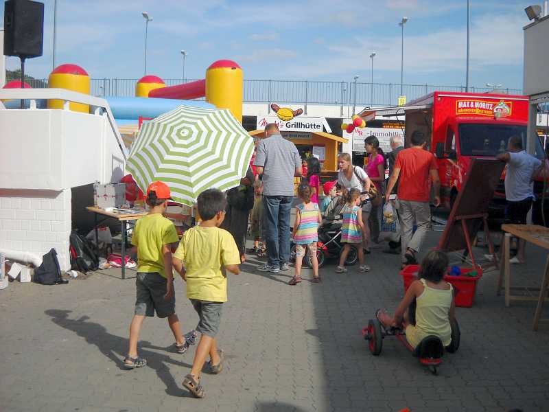 Trotz der Wärme – oder vielleicht auch gerade deshalb – wurden bereits kurz nach dem Aufbau die Hüpfburg und viele Kreativspiele von den Kindern in Beschlag genommen. Sofort kam tolle Spielstimmung auf. Dazu verwandelten die Schminkfeen die Kinder in Feen, Bären, Katzen, Hunde und vielerlei mehr. Das Glücksrad – für die Kinder kostenlos, für die Erwachse- nen wurde um eine Spende gebeten – lockte mit vielfältigen Preisen. Passende Musik und lebhafte Moderation vervoll- ständigten die Festtagsstimmung im Außenbereich, die täglich mit dem großen Bonbonregen ihren Abschluss fand.